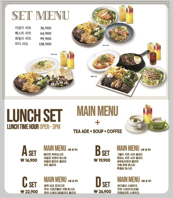 - 세트 구성: 스프 + 메인메뉴 + 음료 + 식후커피