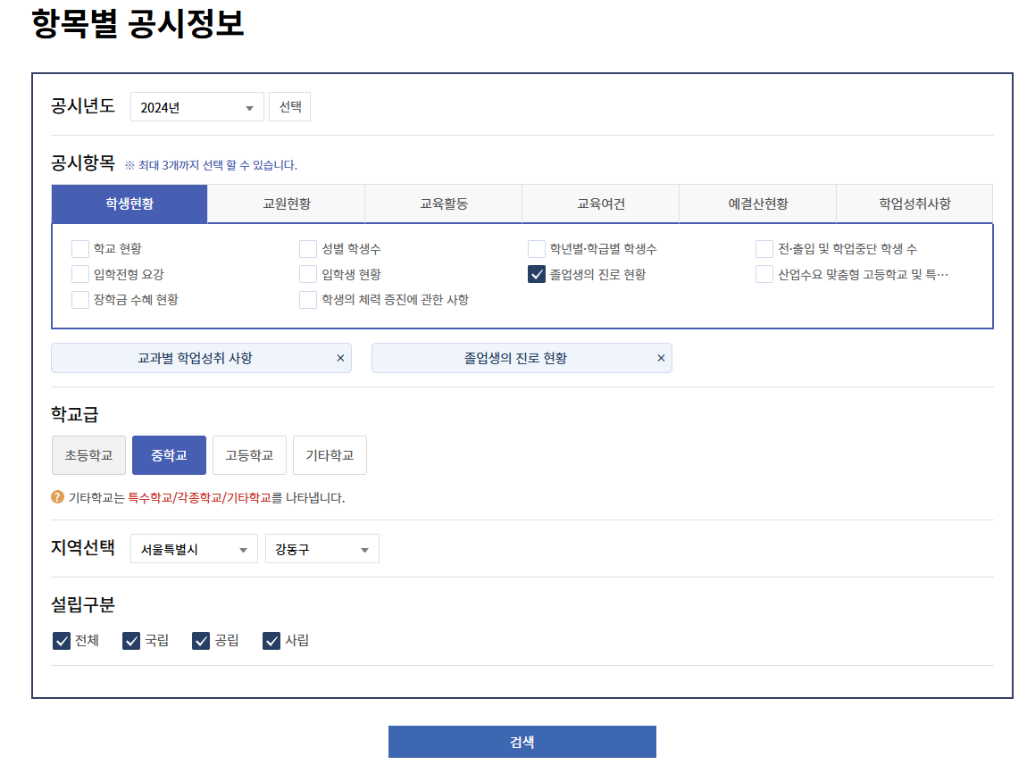 확인법: 전국학교정보 > 항목별 공시정보 > 공시년도 선택 > 학생현황, ‘졸업생의 진로 현황’ 선택