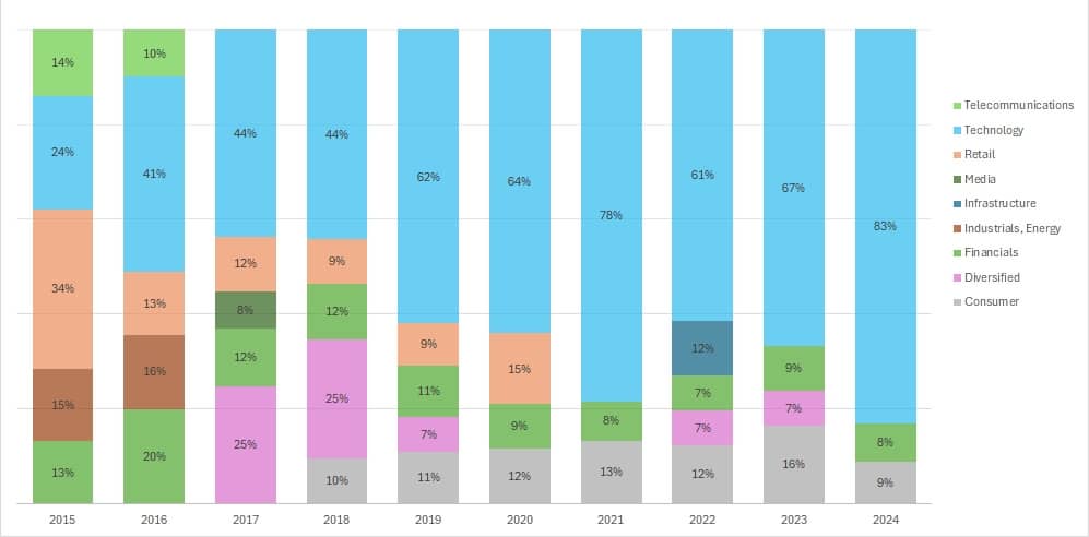 눈에 띄는 점은 2015년 24%에 불과했던 Technology 영역이 2024년 83%를 차지했다는 점입니다. 혹자는 더 이상 새로운 기술은 없다라고 하지만, 글쎄요. 어떤 형태로든 기술이 꾸준히 발전하고 있는것만큼은 사실인것 같습니다.