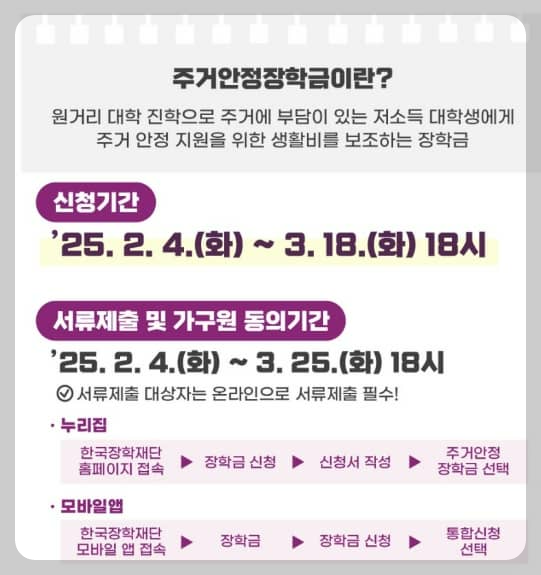 주거안정장학금은 25년 2월 4일(화) ~ 3월 18일(화) 까지 신청 가능하며 서류제출 및 가구원 동의는 3월 25일 (화) 까지 가능합니다. 자세한 정보가 궁금하신 분들은 아래 버튼을 클릭해보세요.