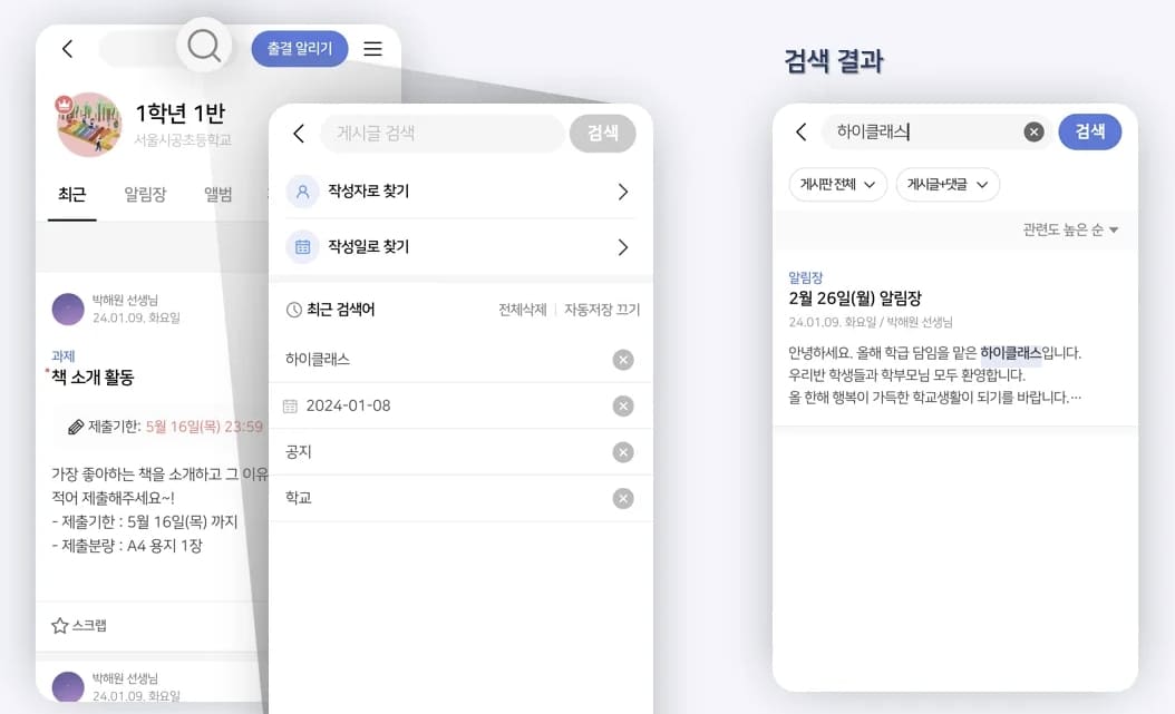 특정 클래스에서 게시글을 검색하고 싶다면, 클래스로 들어가서 검색 기능을 이용해 보세요. 제목과 내용이 들어간 키워드를 검색하여 게시글을 찾을 수 있습니다.