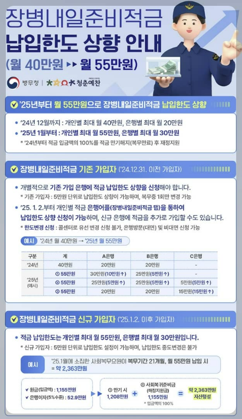 25년 부터 병역 의무를 이행하는 장병들에게 지급되는 봉급이 단계적으로 인상됩니다. 또한 병역 의무 이행에 대한 국가지원을 강화하기 위해 봉급과 별개로 지원되는 장병내일준비적금의 매칭지원금이 상향됩니다. 2025년부터 변경되는 군인 월급정보와 함께 장병내일준비적금 가입방법을 자세히 알려드립니다.