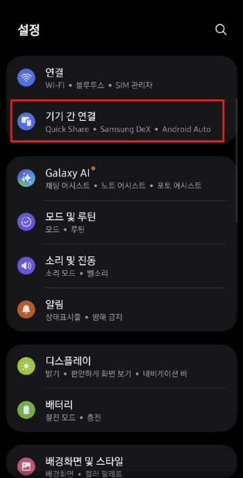 DeX 연결을 위하여 설정 > 기기 간 연결 > Samsung DeX 설정에서 DeX 사용 여부를 사용으로 변경합니다.
