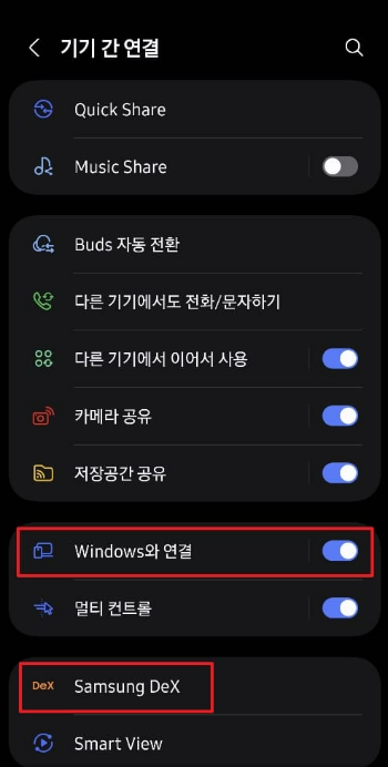 설정 > 기기 간 연결 > Windows와 연결을 활성화한 후 PC에서 Microsoft에 로그인합니다. 알림 및 근거리 공유 사용에서 계속 버튼을 누른 후 권한을 허용하면 Windows와 Galaxy 스마트폰을 연결할 준비가 완료됩니다.